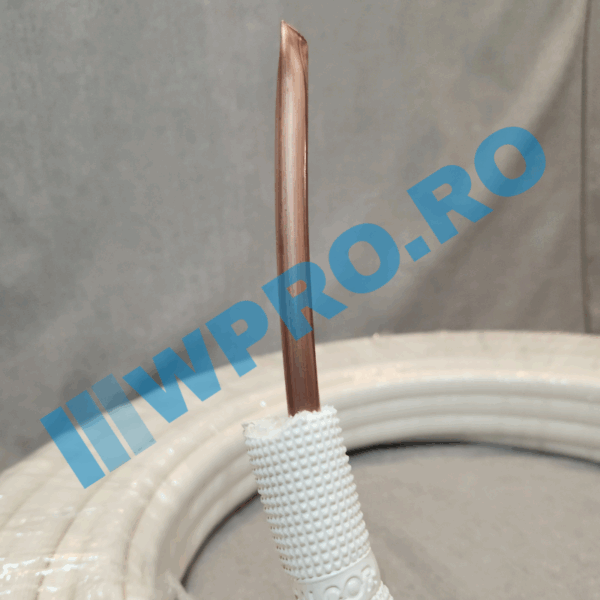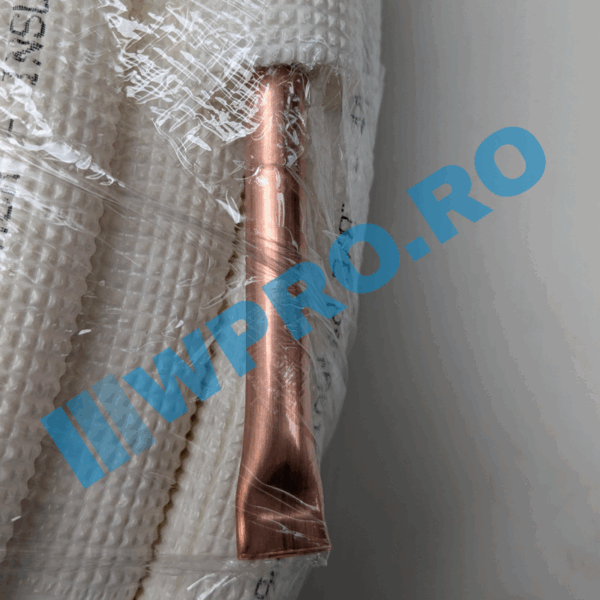 Țeavă din cupru de înaltă calitate, cu grosime perete 0,62 mm și izolație PEX 9 mm, destinată instalațiilor de aer condiționat. Oferă durabilitate, protecție termică și montaj facil.